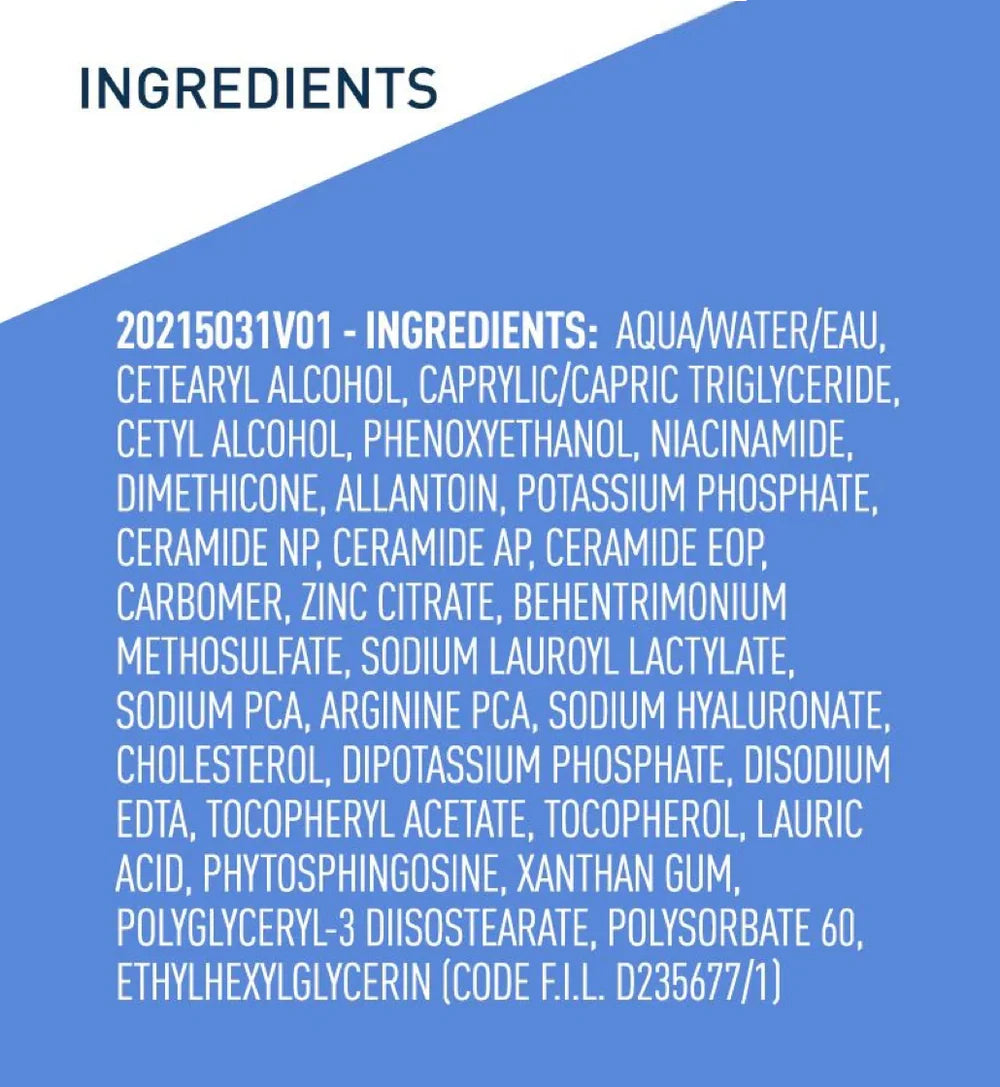 INGREDIENTS: AQUA / WATER / EAU, CETEARYL ALCOHOL, CAPRYLIC/CAPRIC TRIGLYCERIDE, CETYL ALCOHOL, PHENOXYETHANOL, NIACINAMIDE, DIMETHICONE, ALLANTOIN, POTASSIUM PHOSPHATE, CERAMIDE NP, CERAMIDE AP, CERAMIDE EOP, CARBOMER, ZINC CITRATE, BEHENTRIMONIUM METHOSULFATE, SODIUM LAUROYL LACTYLATE, SODIUM PCA, ARGININE PCA, SODIUM HYALURONATE, CHOLESTEROL, DIPOTASSIUM PHOSPHATE, DISODIUM EDTA, TOCOPHERYL ACETATE, TOCOPHEROL, LAURIC ACID, PHYTOSPHINGOSINE, XANTHAN GUM, POLYGLYCERYL-3 DIISOSTEARATE, POLYSORBATE 60, ETHYLHEXYLGLYCERIN