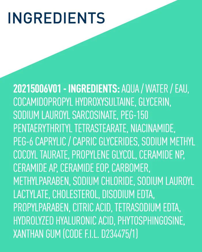 Aqua / Water / Eau, Cocamidopropyl Hydroxysultaine, Glycerin, Sodium Lauroyl Sarcosinate, Peg-150 Pentaerythrityl Tetrastearate, Niacinamide, Peg-6 Caprylic/capric Glycerides, Sodium Methyl Cocoyl Taurate, Propylene Glycol, Ceramide Np, Ceramide Ap, Ceramide Eop, Carbomer, Methylparaben, Sodium Chloride, Sodium Lauroyl Lactylate, Cholesterol, Disodium Edta, Propylparaben, Citric Acid, Tetrasodium Edta, Hydrolyzed Hyaluronic Acid, Phytosphingosine, Xanthan Gum.